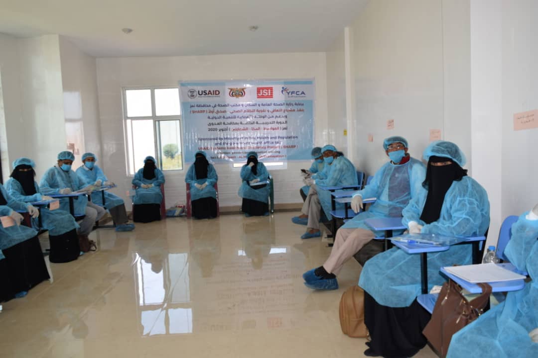 بتمويل من الوكالة الامريكية للتنمية الدولية (USAID) وبرعاية مكتب الصحة العامة والسكان محافظة تعز اختتمت منظمة جون سنو (JSI) وبالشراكة مع جمعية رعاية الاسرة (YFCA) اليوم الثلاثاء 20 أكتوبر 2020 الدورة التدريبية الخاصة بالوقاية من العدوى ومكافحتها (IPC) ل50 عامل صحي في مجال الرعاية الصحية والمتخصصين في الصحة العامة من عدة مرافق صحية بمديرية الشمايتين بمحافظة تعز.