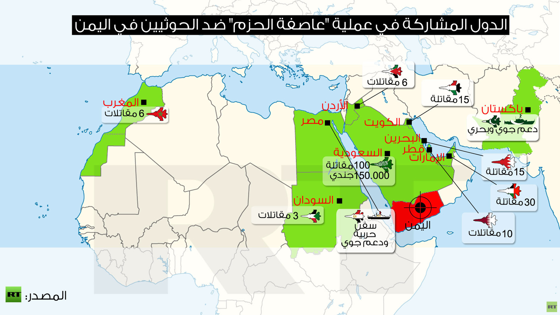 - 4:39 GMT السعودية تشارك بمائة طائرة حربية و150 ألف جندي في عملية اليمن