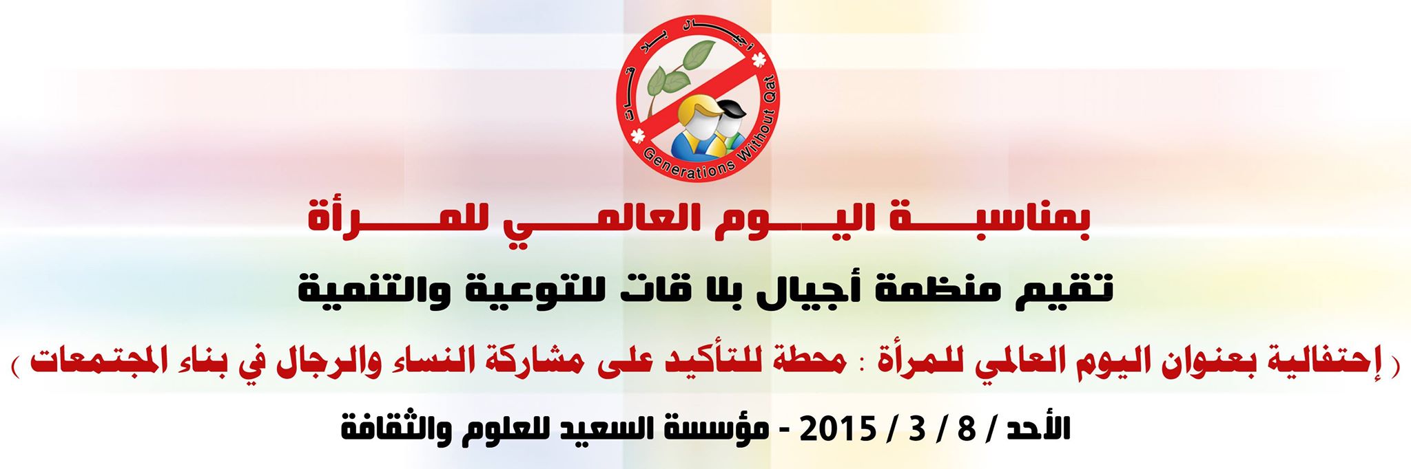 تقيم الأحد المقبل منظمة أجيال بلا قات للتوعية والتنمية بتعز فعالية خاصة باليوم العالمي للمرأة ، تحت عنوان : “اليوم العالمي للمرأة .. محطة للتأكيد على مشاركة النساء والرجال في بناء المجتمعات “.
