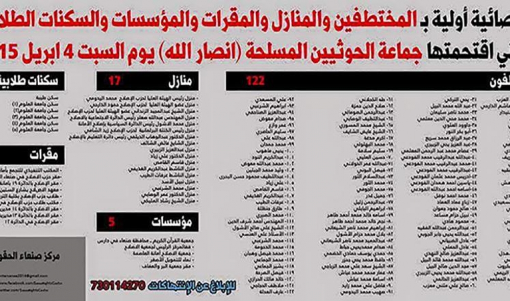 حيث بلغت الاختطافات (122) من قيادات واعضاء حزب الاصلاح وناشطين ،ومداهمة واقتحام (17 ) منزلاً ، و (9) مقرات تابعة لحزب الإصلاح، ونهب (5 )من منظمات المجتمع المدني ،و (6) سكنات طلابية.
